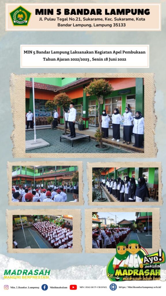 Bandar Lampung (Humas) —- MIN 5 Bandar Lampung lakukan apel awal KBM TP 2022/2023, Junaidy. S,Pd., M.Kes. selaku Kepala MIN 5 Bandar Lampung memberikan sambutan sekaligus membuka KBM TP 2022/2023. Dalam sambutan tersebut beliau menyampaikan bahwa seluruh siswa- siswi MIN 5 Bandar Lampung harus lebih dispilin lagi dalam jam masuk kelas serta seragam lengkap bersama […]